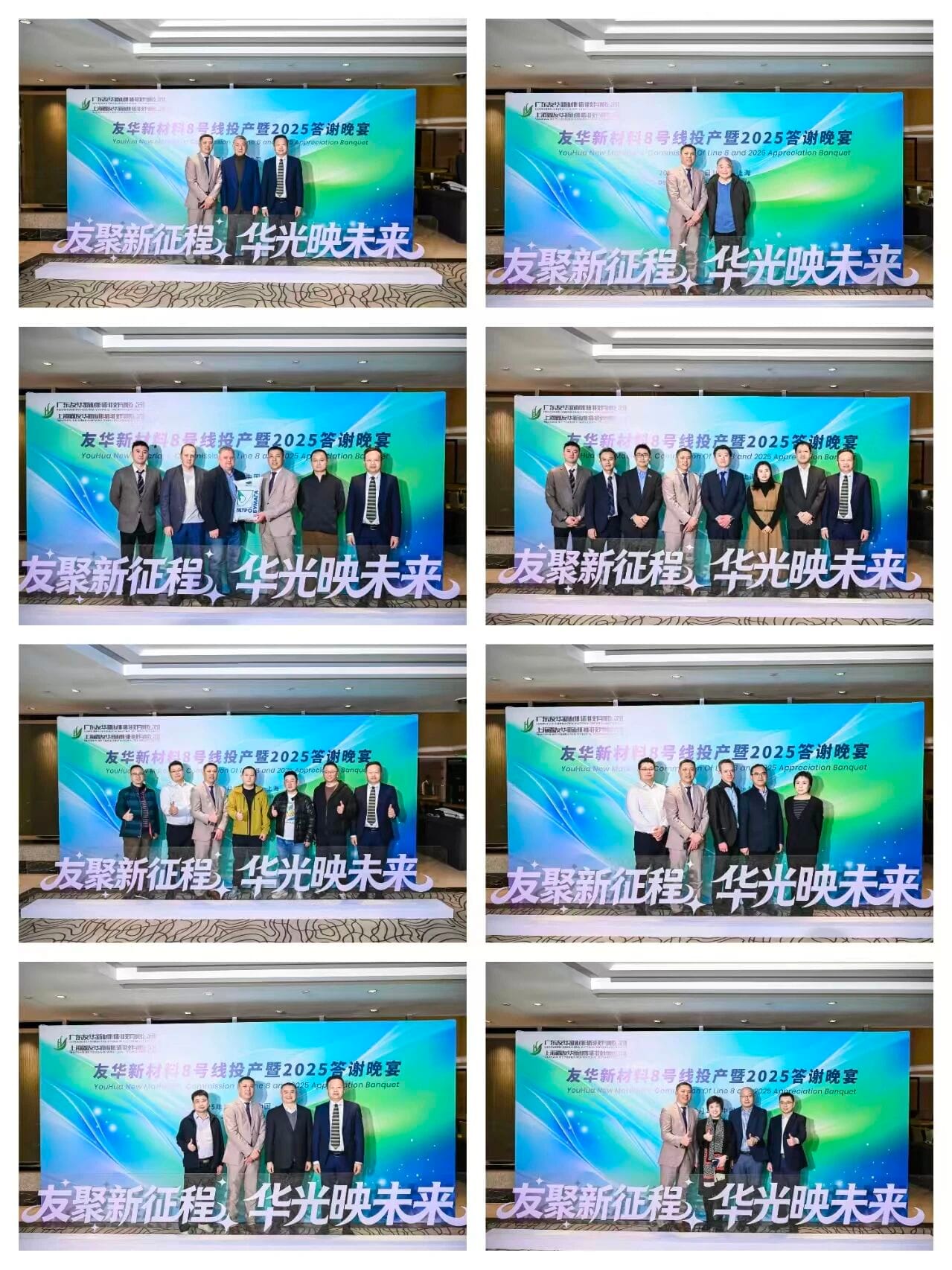 在創新涌動、協作共生的金秋時節,友華新材料在上海錦江湯臣洲際大酒店隆重舉辦「友聚新征程,華光映未來」8號機投產暨2025年答謝晚宴,以誠摯之心回饋一路同行的伙伴們。300 余位來自行業各界的尊貴客戶與核心合作伙伴齊聚一堂,現場賓朋滿座、暖意融融,在璀璨燈光下共話情誼、共敘未來,一同定格了這場屬于友華與摯友們的高光之夜。