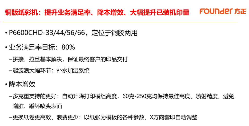 演講中,宗義剛重點介紹了方正應(yīng)對市場挑戰(zhàn)的最新技術(shù)與產(chǎn)品進(jìn)展。針對銅版紙印刷的痛點,新一代P6600CHD系列彩機(jī)定位“銅膠兩用”,通過技術(shù)攻堅,旨在將業(yè)務(wù)滿足率提升到80%,并基本解決銅版紙拼接、拉絲問題。該系列設(shè)備還實現(xiàn)了60-250克多克重紙張的自動適配打印,并通過智能化設(shè)計,使換卷與套印調(diào)整更高效,減少浪費。