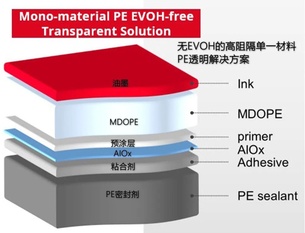 EVOH是一種具有良好阻隔性能的聚合物,但擠出EVOH層通常相當厚,這使得符合現代關于包裝中非單一材料數量的要求更具挑戰性。此外,由于醋酸乙烯單體(VAM)短缺,EVOH目前供不應求。oneBARRIER正在為高阻隔全單材料PE生產不含EVOH的解決方案,減少非單一材料的含量,從而最大限度地增加PE用量,并滿足單一材料的嚴格定義。通過這種方式,博斯特提供了一種可回收利用且經濟的包裝結構,同時確保出色的阻隔性能。