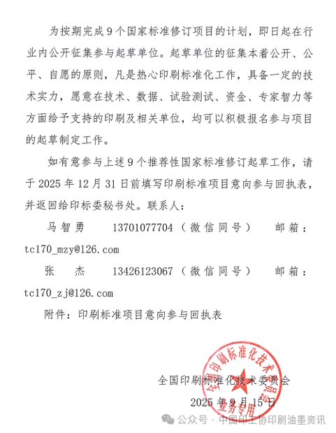 起草單位征集本著公開、公平、自愿的原則,凡是熱心印刷標準化工作,具備一定的技術(shù)實力,愿意在技術(shù)、數(shù)據(jù)、試驗測試、資金、專家智力等方面給予支持的有關(guān)企業(yè)或科研機構(gòu)、院校,均可報名參與標準起草制定工作。如有參與意向,可咨詢中國印工協(xié)印刷油墨分會或全國印刷標準化技術(shù)委員會,并于2025年12月31日前填寫印刷標準項目意向參與回執(zhí)表,返回至印標委秘書處。