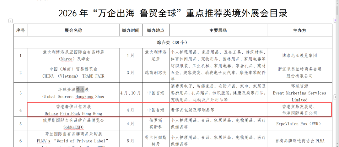 廣東省商務(wù)廳率先在《2026年“粵貿(mào)全球”廣東商品境外展覽平臺清單》中將其列為官方認證項目;與此同時,山東省商務(wù)廳在《2026年“萬企出海 魯貿(mào)全球”重點推薦類境外展會目錄》中,也明確將其展會體系中的高端組成部分——香港奢侈品包裝展——納入重點推薦之列。