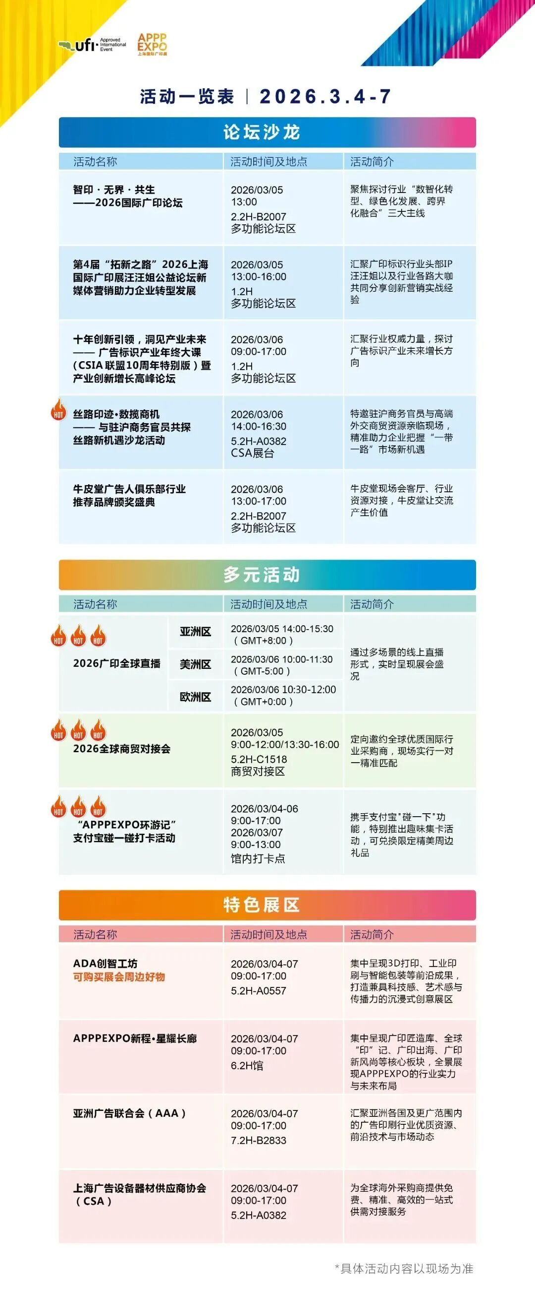 作為廣印行業的前瞻性交流平臺,APPPEXPO 2026延續了“展+會”雙輪驅動模式,深挖行業資源,升級展會內容配套,同期舉辦多場主題論壇、技術講座,廣邀行業領袖、專業人士及眾多大咖,聚焦“AI+”數智升級、市場趨勢洞察、可持續發展路徑、數字化轉型實踐、創新營銷模式及出海布局等關鍵議題展開深入探討,分享前瞻行業趨勢,激發創新思維。展會四天,將持續輸出有價值的行業思考,為行業注入深刻洞察與行業智慧。