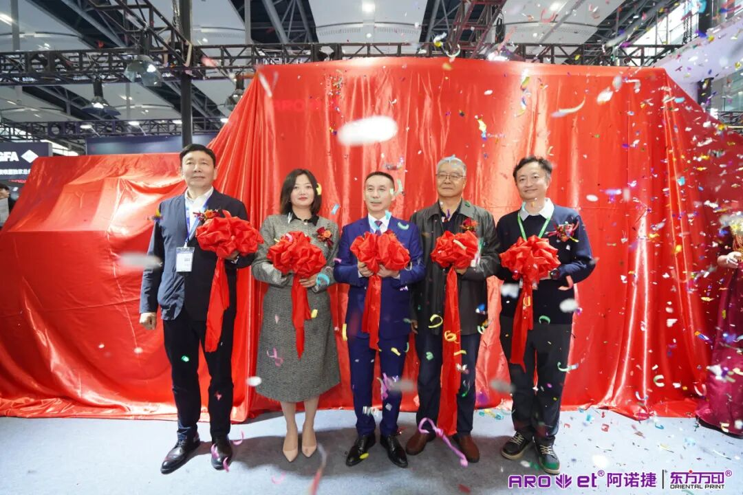 3月4日下午2:00,阿諾捷展臺嘉賓云集。在與會者的共同見證下,阿諾捷總經理王策鑫、中國印刷及設備器材工業協會標簽分會秘書長賈燕、中國包裝聯合會包裝印刷與標簽專業委員會主任委員許文才教授、西安理工大學印刷包裝與數字媒體學院教授劉琳琳、美祺集團董事長張宇忠共同登臺,為本次發布的新品DF-330-HD數碼標簽印刷機剪彩揭幕。伴隨著禮炮聲和掌聲,這款凝聚阿諾捷多項核心技術的1200dpi高端機型正式亮相。