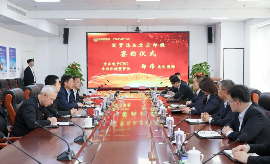 方正電子CEO、方正印捷董事長鄭偉,宏賢達(dá)集團(tuán)董事長、總裁張俊賢及雙方代表出席儀式。