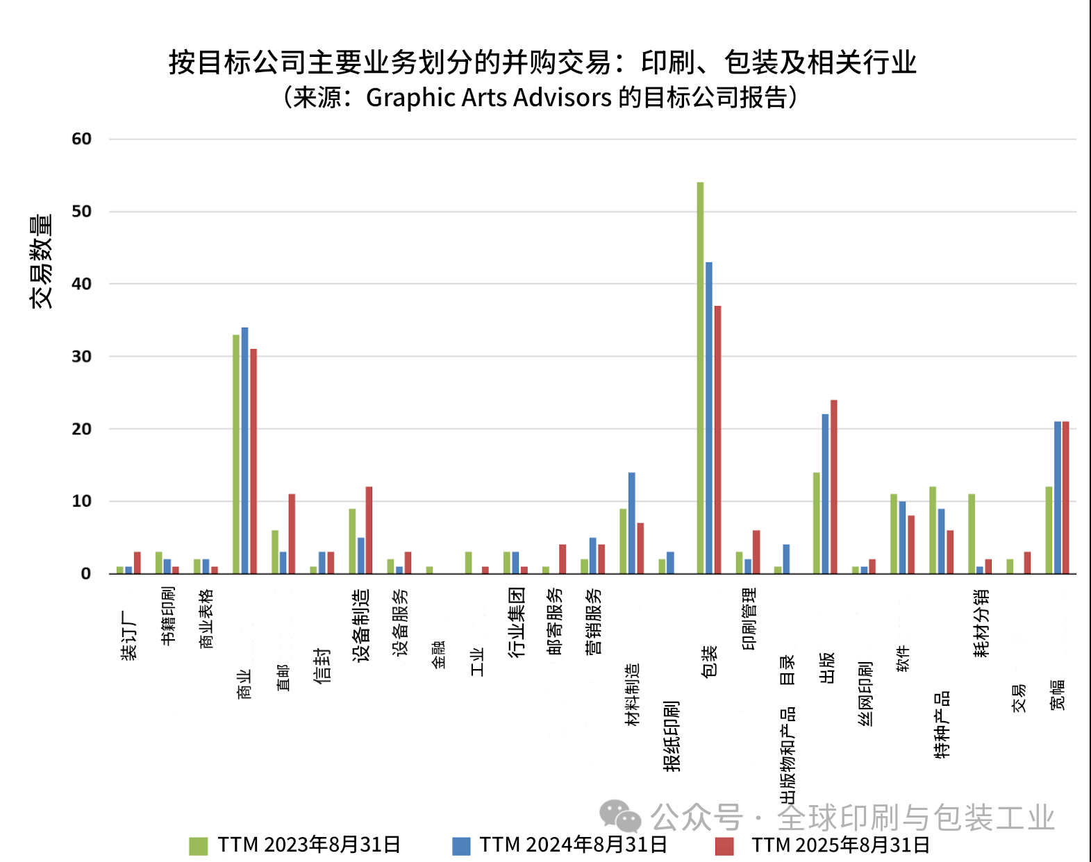 十四年來,GAA(印藝顧問公司)持續記錄與評論以包裝印刷行業為中心的多條業務線的并購活動,重點覆蓋商業印刷、包裝(標簽、折疊紙盒、軟包裝)、大幅面印刷市場等。在每年8月,都會回看過去12個月的交易特征,以判斷行業的未來走向:哪些細分的并購增多或減少?買方完成收購的主導邏輯如何變化?是擴張網絡還是并入整合?對未來各細分的潛在交易活動有何啟示?