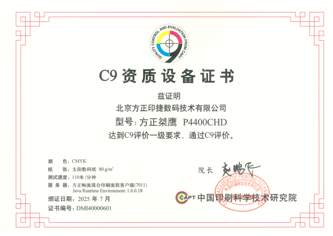 C9認證不是貼紙,而是將嚴苛標準寫入每臺方正桀鷹設備的基因,讓國產噴墨直接對標國際,把“放心、省心、信心”印進每一張紙。
