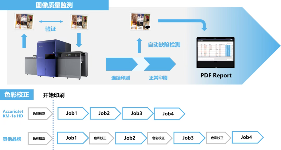AccurioJet KM-1e HD無需進行頻繁色彩校正,并支持自動監測印刷缺陷,不僅可節省色彩校正所浪費的時間,還可避免人工檢測帶來的誤差和材料浪費,由此能大幅降低作技能門檻,作人員即使沒有專業背景也能輕松上手,可大幅減少培訓時間與成本。