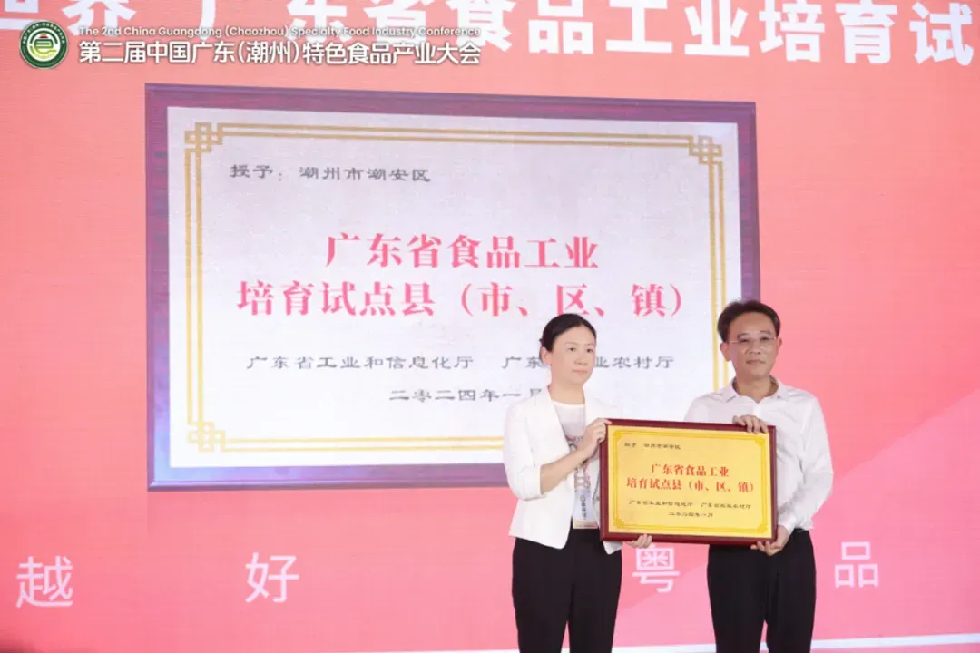 作為中國傳統食品產業創新升級的示范區,潮州市以及潮安區特色食品產業也是廣東省“粵食越好 粵品世界”培優扶強的重點食品產業集群之一。在第二屆“潮食會”開幕大會現場,廣東省工業和信息化廳為潮州市潮安區頒發“廣東省食品工業培育試點縣(市、區、鎮)”牌匾,助力潮安區特色食品產業發展再提速。